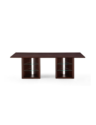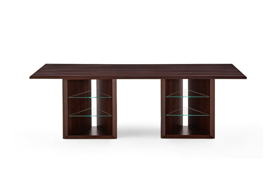 From the fusion of retro- and futuristic-flavored elemnts, the duo David and Nicolas conceive for Gallotti&Radice the Prism Desk a desk in Rosewood India is traversed along the entire length of its top by natural aluminum inlays. The two trapezoidal bases house two shelves each in 8mm tempered extralight glass. The Prism Desk is offered in two variations, differing in length.