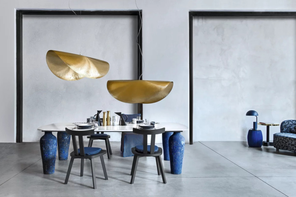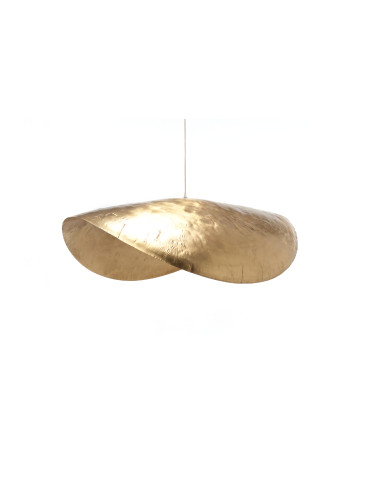 Its distinctive shape, characterised by a curved brass disc, not only reflects light in an enveloping way, but also conveys a sense of warmth and sophistication. Its golden, warm glow has the power to transform the atmosphere of any room, adding an aura of elegance to any setting. The Brass 96 pendant lamp is ideal for large spaces where its commanding presence can really shine. For an exceptional visual effect, it can also be combined with the Brass 95 suspension lamp, which has more modest dimensions (80 x 70 cm). This combination can be placed over sofas or tables. It provides a unique touch of style and amazing lighting.