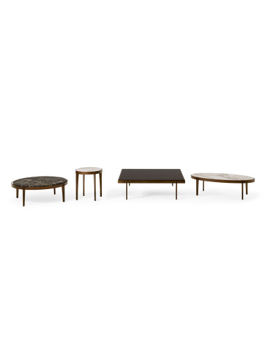 It is characterized by the essential shape and the solidity of the materials in which it is manufactured that make it slight and resistant at the same time. The frame of this table comes in solid Canaletto walnut or in metal, the top in marble or in plate glass. Both the base and the top are available in different finishes and versions. The Ago low table is produced by Giorgetti in round, oval and square shapes.