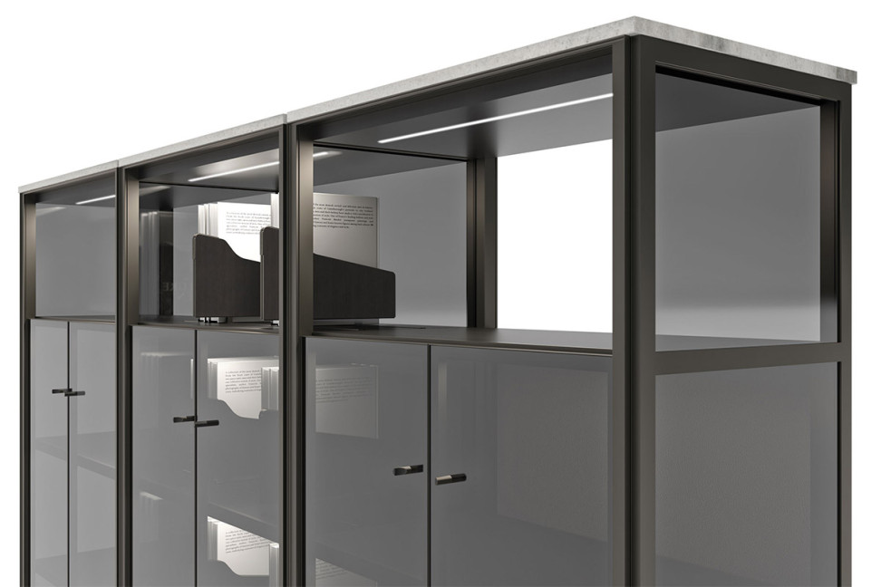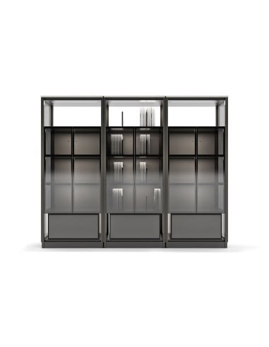 The return to rigorous volumes, orthogonal lines, and minimalist forms define Domus, which, thanks to its modular nature, allows for endless customization. It is a program of elements with an aluminum structure in a brushed titanium bronze finish, equipped with standard LED lighting. The sturdy metal structure becomes lightweight thanks to the use of glass panels, which, along with wooden and leather inserts, give the Domus storage unit by Giorgetti a remarkable breath, offering a modern and sophisticated elegance.
