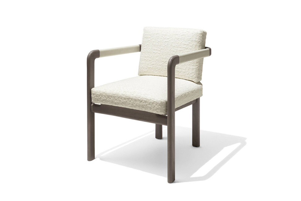 Created by Dainelli Studio for the Giorgetti brand, the Montgomery armchair and small armchair feature a solid ash frame available in four finishes: natural, anthracite grey, biscuit and ash grey. The seat and back are upholstered in fiber-covered polyurethane foam in different densities, and the special feature lies in the mechanism for fastening the backrest to the frame. In fact, it is attached with an elastic band hooked onto a small metal cylinder that embellishes the back of the armchair. This detail reminds the frogs of the Montgomery from the 1980s from which it takes its name. The Montgomery seats can be upholstered in removable fabric or leather.