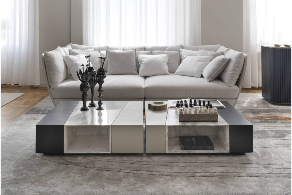 This low table is characterized by the union of first-rate materials to create a truly unique product. Scaleno by Giorgetti is in fact made up of three sections: one in wood, one in leather and one in marble. Open compartments run along the lateral surface of Scaleno, giving this interesting table a remarkable lightness.