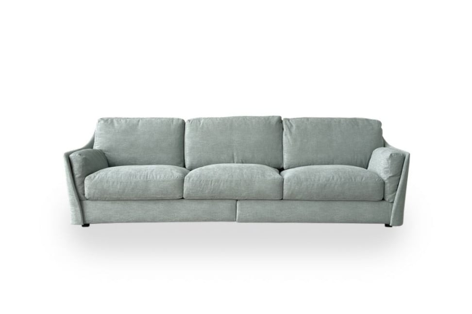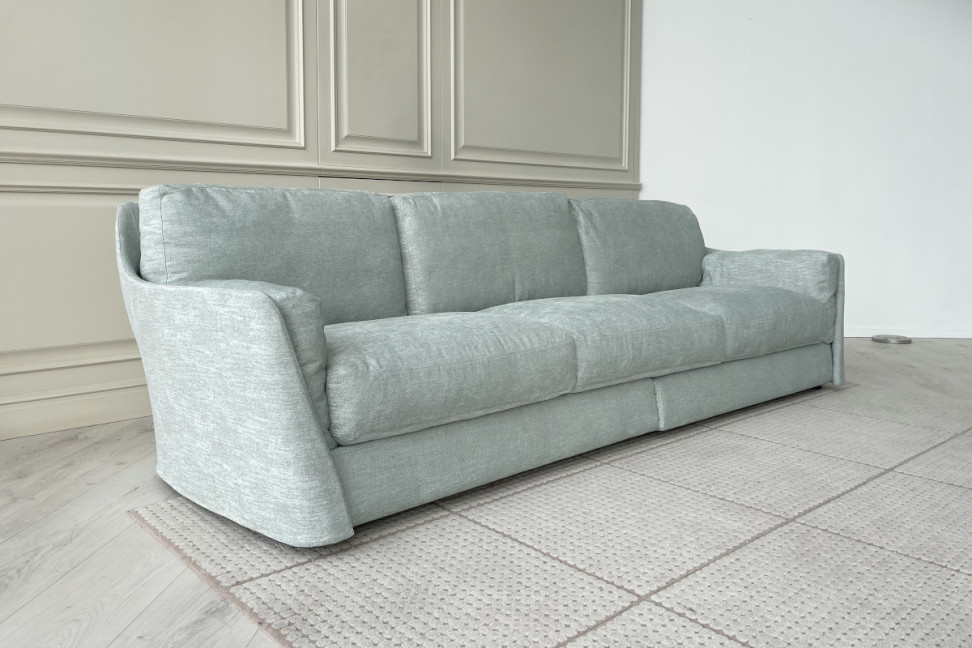 The Vittoria sofa in Expo Offer in our showroom is the mono-color version totally covered in gray and aqua green melange fabric, with beech wood feet.