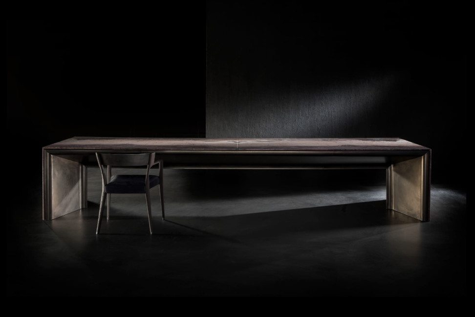 The Alter Ego table, signed by designer Massimo Castagna for Henge, perfectly combines two materials: metal and stone. In fact, the base is available in platinum, titanium or burnished steel while the top can be made in a wide range of stones from the collection. With this timeless design, the Alter Ego table is a classy piece of furniture that will stand out in any setting.