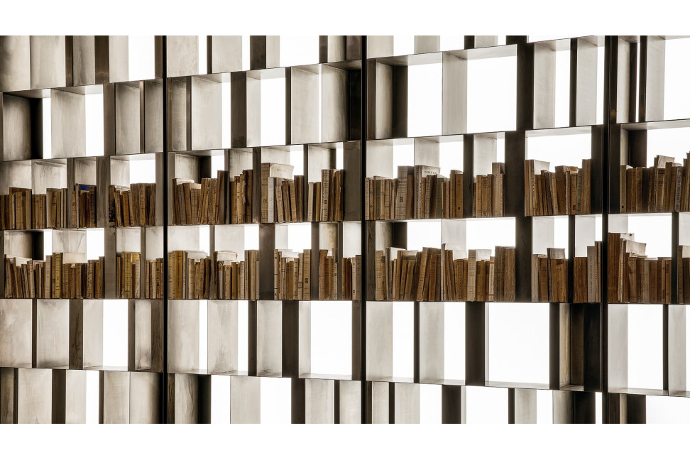 The price of the Bistrot boocase starts at approximately 29,000 EUR and can exceed 45,000 EUR, depending on the selected dimensions and finishes. The bookshelf is available in various sizes to suit different space requirements, with widths ranging from 198 cm to 316 cm, including options of 238 cm and 276 cm, and a height of 270 cm. Available finishes include burnished titanium, platinum, and burnished brass, offering a variety of choices to fit any style.