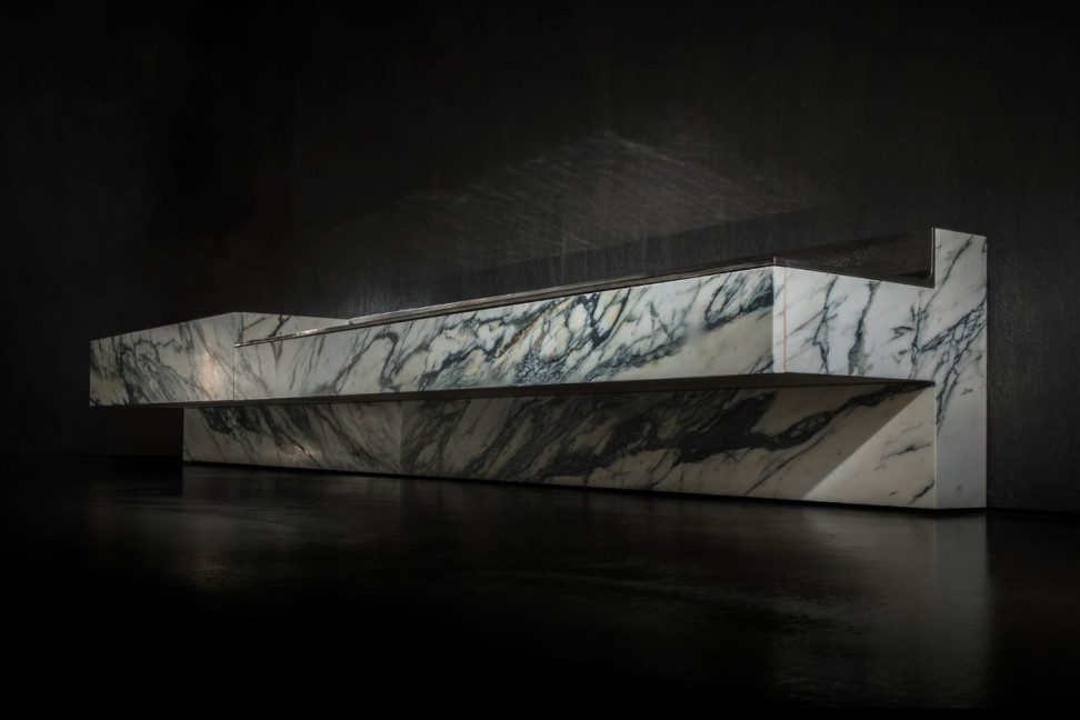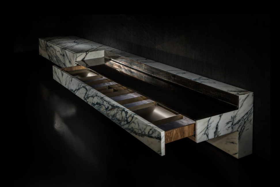 Designer Massimo Castagna in collaboration with Henge has created the Dogma wall cabinet with a cantilevered top that adds character to the design. The structure is made of wood and covered in stone with a supporting tray in cast metal or stone. The Dogma cabinet is an elegant and unconventional piece of furniture.
