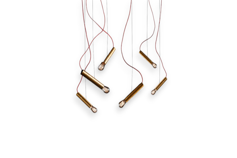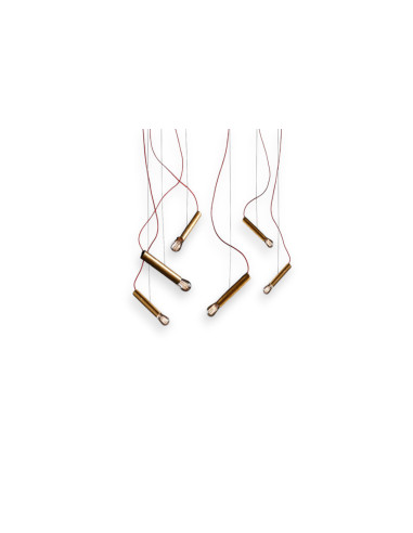 Pipe Light - S suspension lamp is created by the designer Massimo Castagna for Henge, and has a minimalist shape: the brass body (with a diameter of 4.5 cm) is supported by a metal cable that connects it to the ceiling and that meets the power lead, covered in red silk, thus creating an interplay of straight and curved lines. Pipe Light - S has a tungsten light bulb with warm light, blown glass ampoule with visible filament, shaped like an old carbon lamp. This lamp is available with burnished brass and black burnished brass finish; the inclination is adjustable and the infinite possible combinations make it the protagonist of numerous compositions, customized at will.