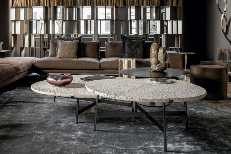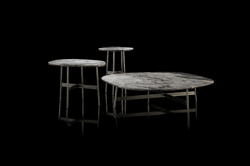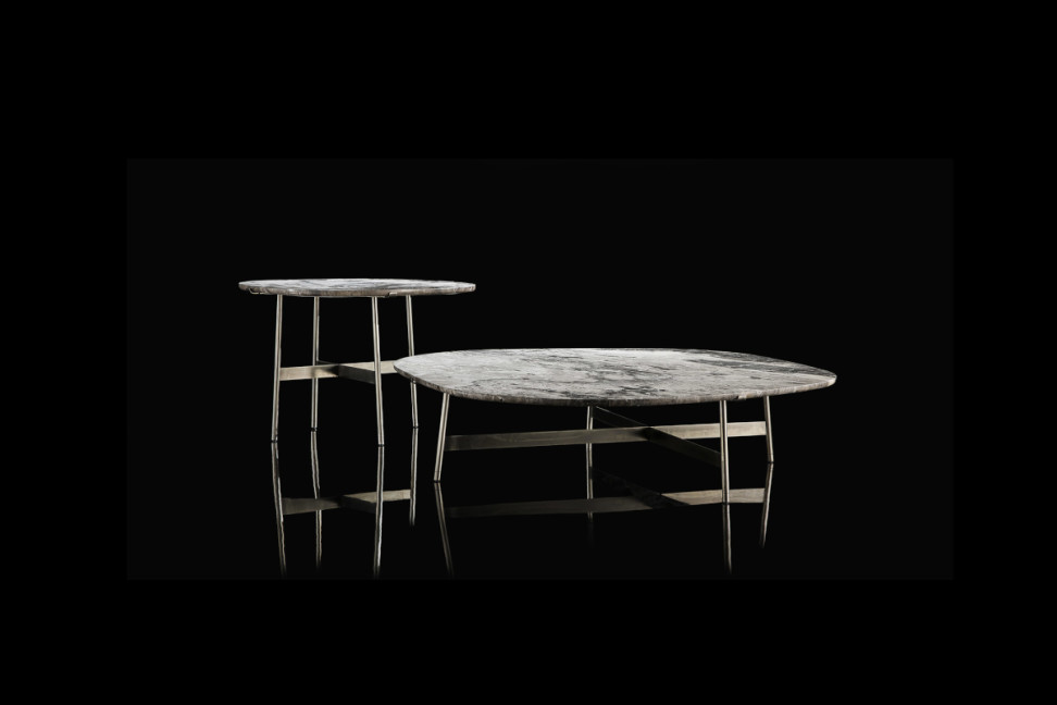 The Primitive Coffee Table by Henge, designed by Massimo Castagna, plays on the sharp contrast between the lightness of metal and the sculptural strength of stone.