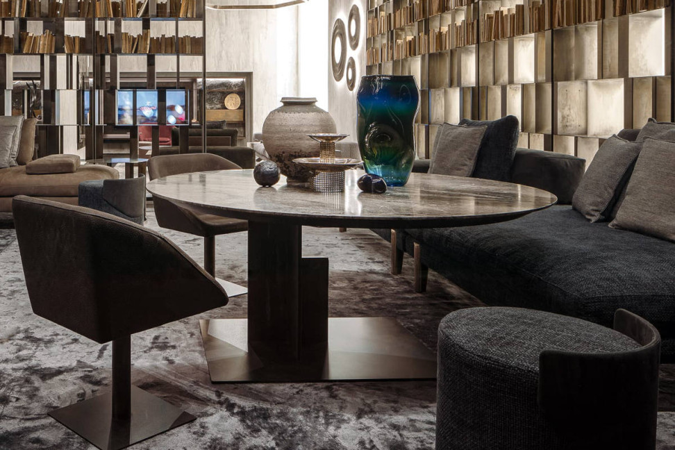 Shift table, designed by Massimo Castagna for Henge, is an extremely original table, as the top, available in various stone, is equipped with a mechanism that allows it to rotate, changing its position with respect to the base, which is proposed in hand-burnished steel according to traditional techniques. The Shift table is proposed in the swivel version with dimensions cm.Ø140x65h and cm.Ø160x65h and in the fixed version, cm.Ø160x75h and cm.Ø180x75h.