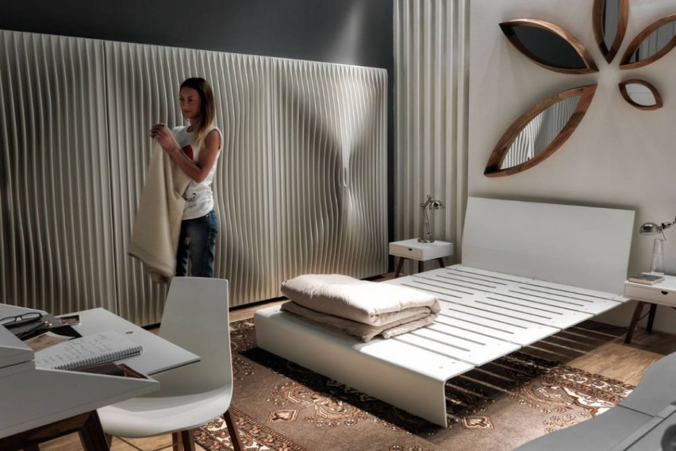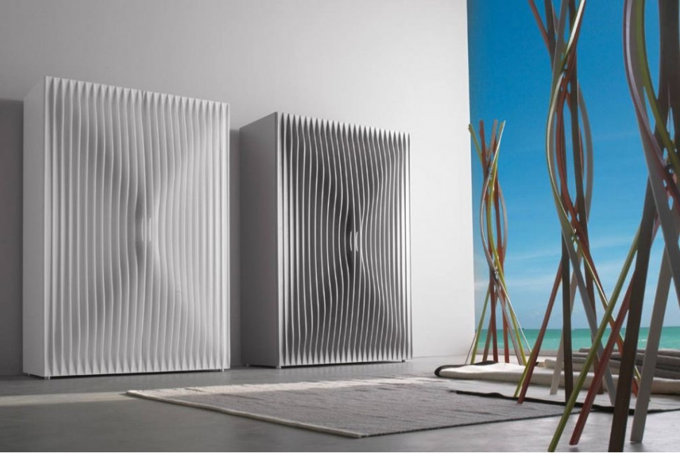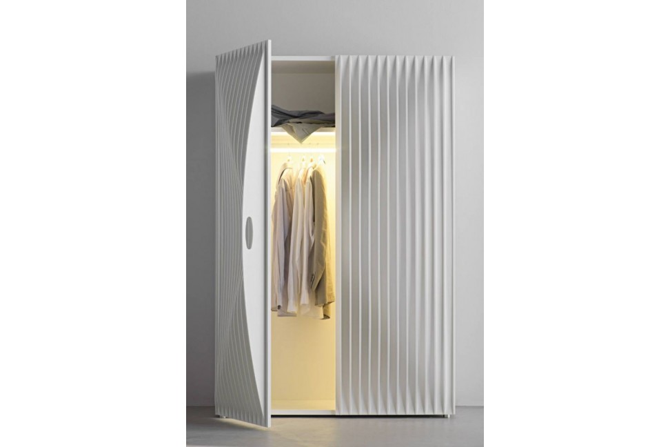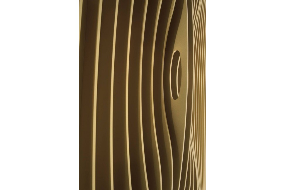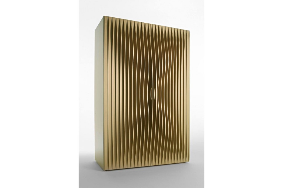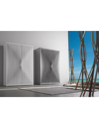 The Blend storage unit is characterized by the dynamic effect of the surface, obtained using many thin sheets of MDF. The sheets have different shapes in order to obtain a soft movement that animates the surfaces: the theme of dynamism is the predominant feature of all the projects by Rashid. This storage unit combines functionality and aesthetics, as the perfect handles inserted between the sheets, or the bi-color lacquering finish for the inside and the outside surface.