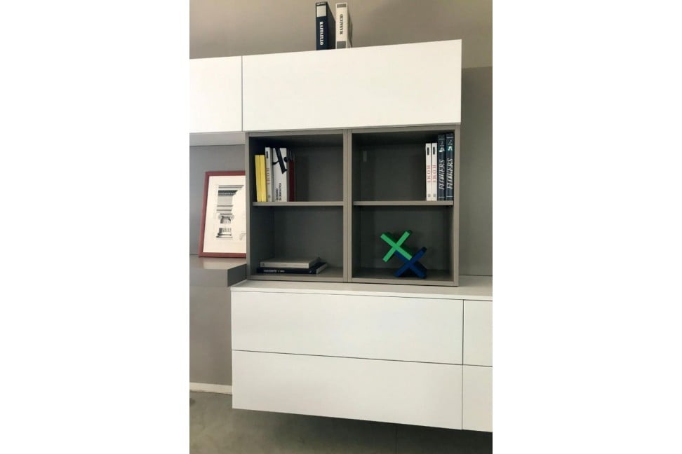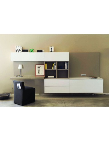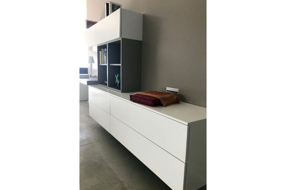 The Open LROS hanging composition, on sale in our showroom, is equipped with a writing desk, shelves, drawers and a comfortable space to place the tv. This modular system is distinguished by its compact shapes, and for the elegance of lacquered surfaces.