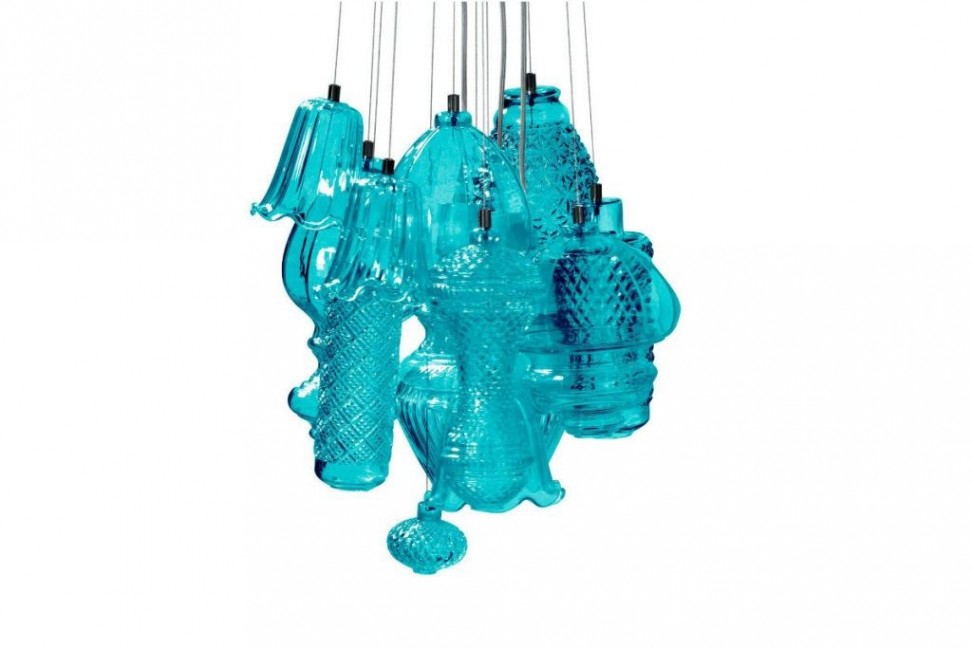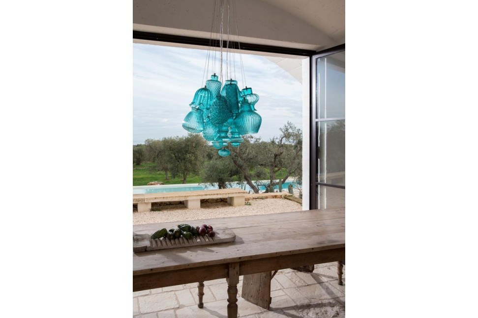 The diffused light lamp is available in turquoise or transparent glass, and comes both in the composite version, in five variants of different diameters, and in the single one.