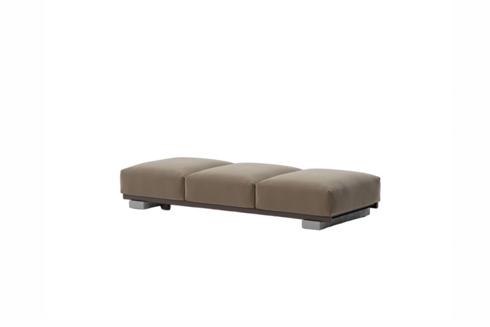 To be used as a complement to the sofa or on its own, the Molo bench designed by Rodolfo Dordoni for Kettal represents the sense of refuge and mooring from the waves of the sea to the land. With an aluminium or teak frame and fabric upholstery, the real special feature of the Molo collection are the feet available in either teak or concrete.