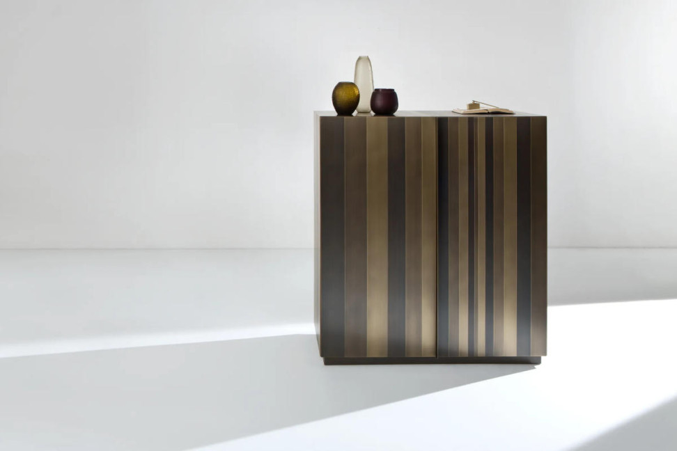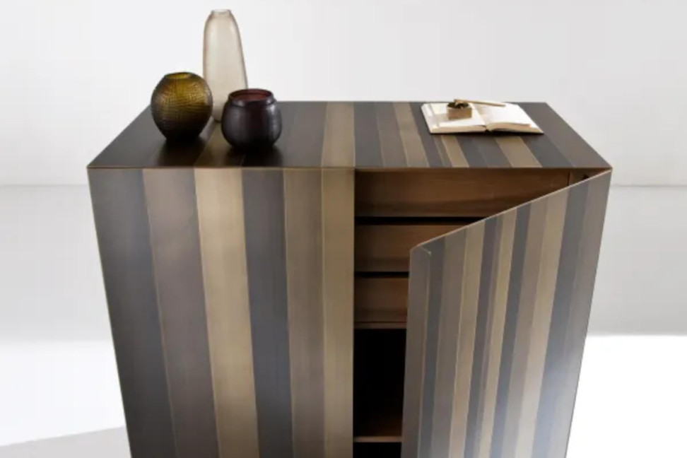 The ST 01 storage unit by Laurameroni is a tall sideboard with hinged doors with a formal yet essential style, which emphasizes the beauty of metal available in numerous variations.