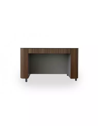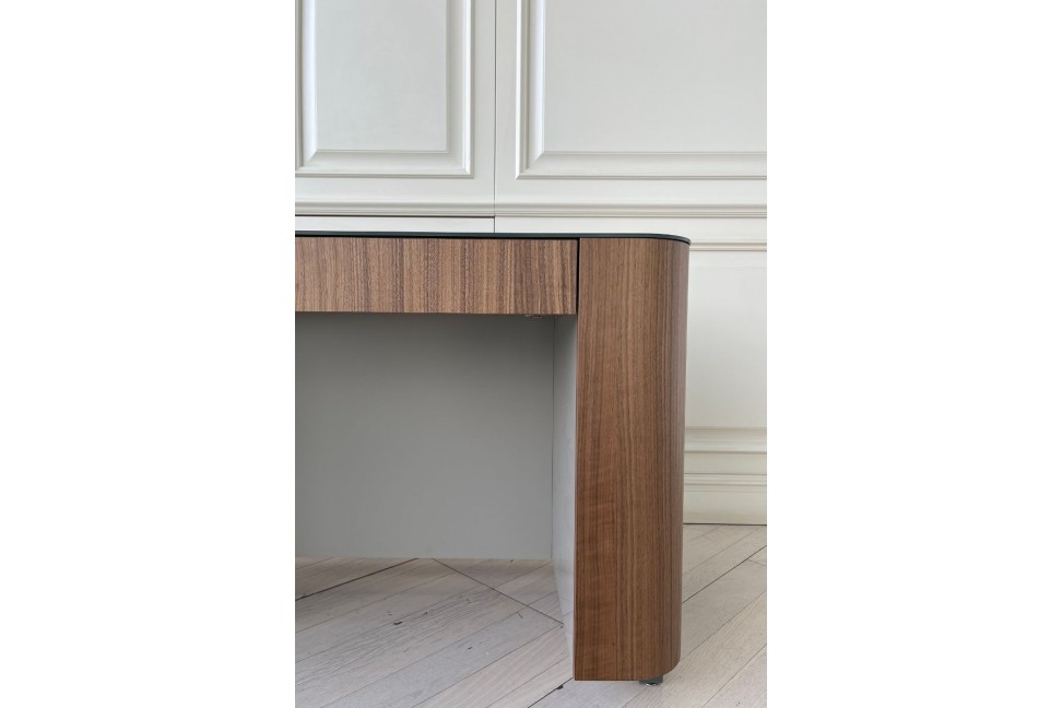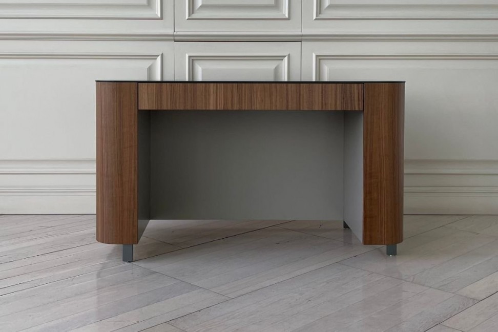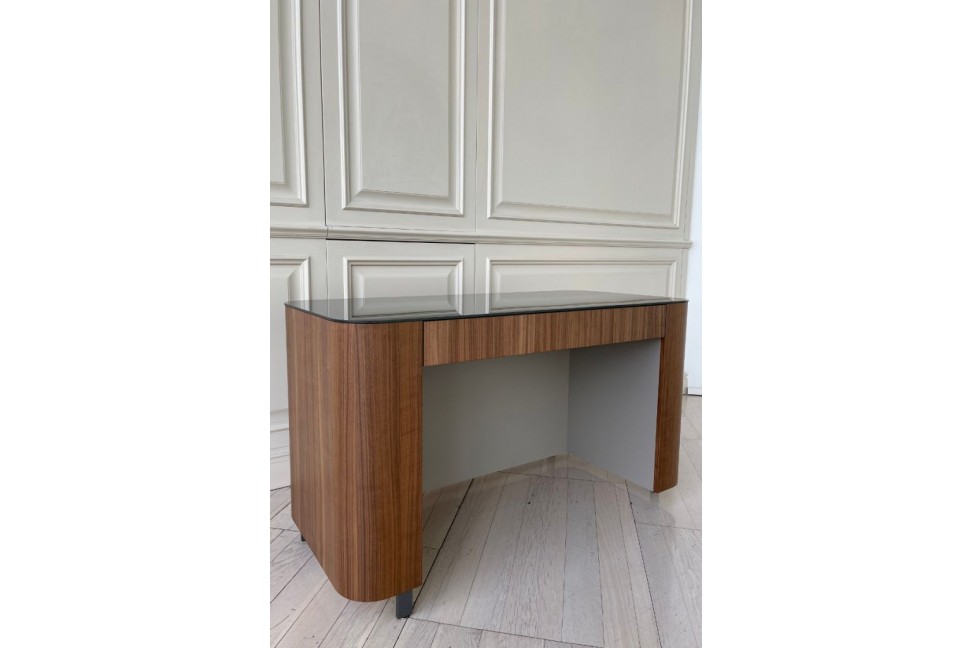 The Postmoderne line was born from the design of Eric Jourdan for Ligne Roset. Like the rest of the collection, the Postmoderne desk plays with soft lines with a distinctly retro flavor and with the union of multiple materials and finishes. In this case, the wood of the main body is accompanied by an internal lacquered insert and an elegant glass top.