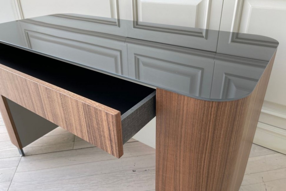 The Postmodern desk on Expo Offer in our showroom has a body with walnut finish, argile (clay) lacquered interior and plomb (lead) lacquered glass top.
