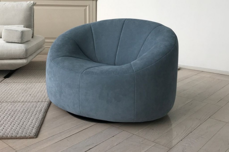 The Pumpkin armchair on Expo Offer in our showroom has a light blue velvet upholstery and a swivel base in black lacquered steel.