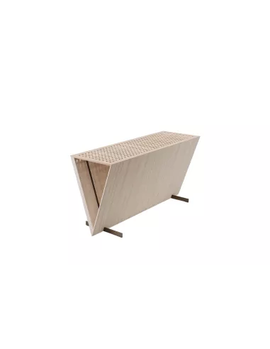 The supporting structure of the Alvea console is made of steel sheet painted with powdered epoxy in a refined burnt color. This choice provides exceptional robustness and durability while ensuring a solid base for displaying the wooden elements. The top is made of solid oak elements skillfully interlocked in a checkerboard pattern. This artisan detail adds a touch of craftsmanship and complexity to the console, making it a unique work of art. The perimeter frame enclosing the wooden elements is entirely made of solid oak. To ensure maximum stability, the Alvea console is equipped with thermoplastic material supports, which provide a secure footing on the floor.