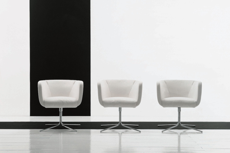 The Jelly armchair is characterized by a steel frame with revolving base in chromed tubular stainless steel, the padding in cold foamed polyurethane, and the cushions in polyurethane foam covered with acrylic fibre layers. The cover is available in leather or fabric, which version is the only fully removable.