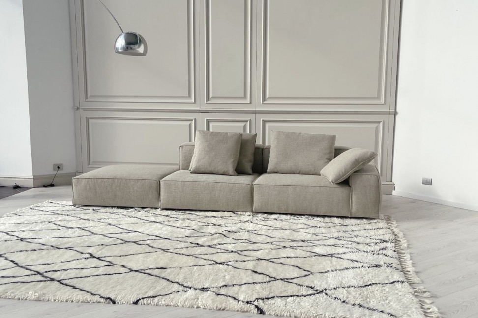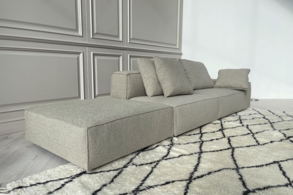 The Neowall Sofa 2021 Ed. in expo offer in our showroom is completely covered in rope gray fabric; it is composed of two seats and a pouf that can be moved at will, and is accompanied by four loose cushions.