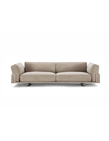The Ritual sofa, designed by Giuseppe Viganò for the made-in-Italy brand Longhi, has an upholstered frame and rests on feet with a bronze-painted metal sub-base. The seat cushions are generously upholstered, as are the back cushions, which are also equipped with an internal frame to ensure that they remain in a slightly tilted position. A special feature of the Ritual sofa is the metal band that frames its outer structure, available in a variety of finishes. Ritual is a modular sofa that leaves a wide compositional choice and can be upholstered in either fabric or leather.