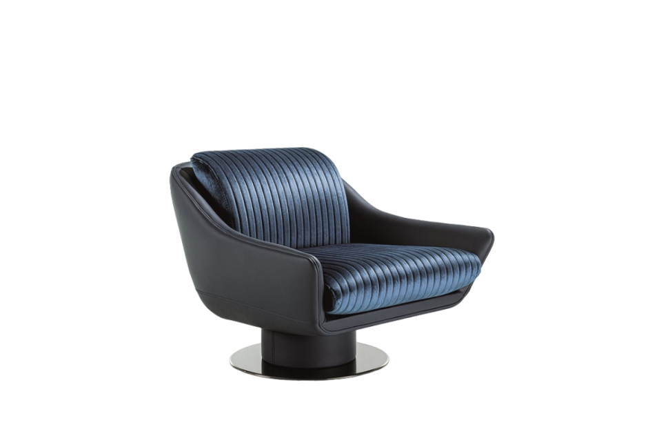 The Sol armchair, designed by designer Ben Wu in collaboration with Longhi, has a swivel metal base that comes in polished shaded Brown, polished light gold, matt Champagne gold, polished chrome, polished black chrome, matt nickel, and bronze painted finishes. The upholstery of the Sol armchair is offered in both fabric and leather and for the shell, it is possible to select a different upholstery from that of the seat and back.