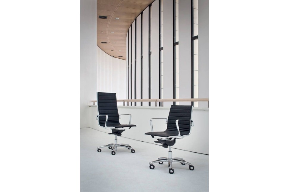 This collection has been designed and realized by Luxy and is an integral part of the Italian company's history. It comes from an idea, which has become afterwards a patent, to fix the supporting structure to the upholstery through a single pipe without any screws. The Light executive armchair renounces to any superfluous element in favor of a clean and pure style where the elegance of the steel frame has been combined with sophisticated materials such as leather or mesh. This armchair is available with medium or high backrest, with swivel or fixed base.