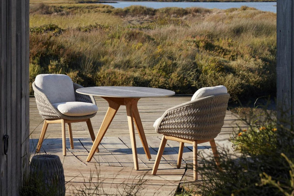 The Sandua outdoor chair stands out among outdoor chairs for its design that combines artisanal tradition with contemporary trends. Hapelt has skillfully merged the robustness of teak with the organic forms of the weaving, enriched by the softness of the ample cushions. It is available in two combinations: natural teak with Dicord® Pepper weave and Salty Dunes cushions, or dark teak with Dicord® Anthracite weave and Crisp Water cushions.