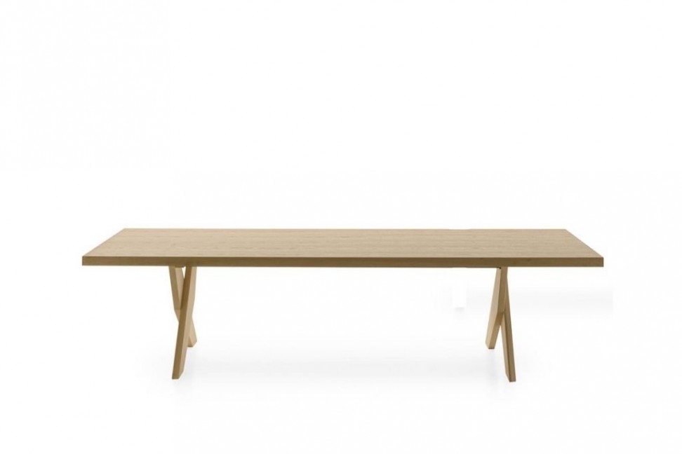 A distinctive feature of Ares table by Maxalto is certainly the strong aesthetic of the solid wood X-shaped leg structure, formed by two overlapping elements. The solid thick rectangular top is available in two sizes and in various woods: natural wengé, light brushed oak, black brushed oak and grey or smoked oak.