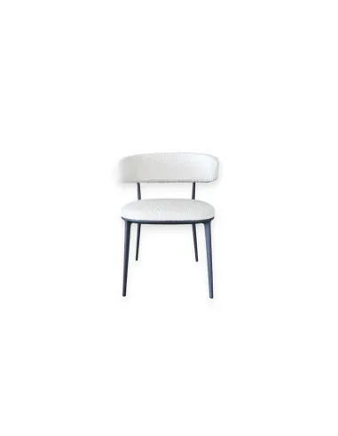 The Caratos chair on display in our showroom has a structure made of painted graphite aluminum casting, while the seat and backrest are covered with a refined white bouclé fabric that, in contrast with the structure, enhances its shapes and elegance.