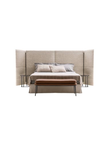 The distinctive feature of Dike bed, designed for the well-known Italian brand by the designer Antonio Citterio, is undoubtedly the headboard, a true architectural work of art that acts like a background to the bed frame. Composed of various panels connected by elegant metal hinges, the headboard stands out in all its majesty, almost like a theatrical backdrop, representing a sort of barrier between the outside world and the private sphere. The impressive volume of this piece of furniture is enhanced by the upholstery, made of an exclusive embossed fabric specifically designed for this product.
