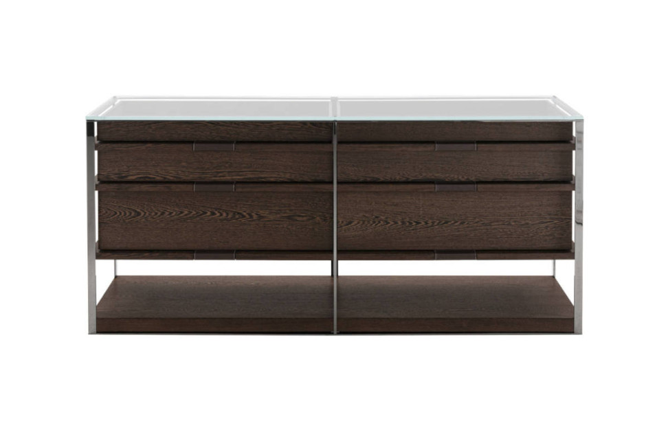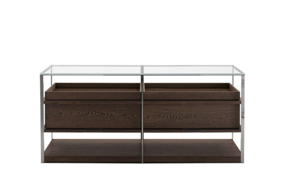 Lithos containers by Maxalto are available in one size (L180xP50xH80cm) and in three different versions with drawers and pull-out shelves. In all models, the transparent extralight glass top is combined with a metal structure painted in different colors: burnished nickel, black chrome, graphite and amber. The drawers and pull-out trays, on the other hand, are in veneered MDF wood fiber with a leather-covered bottom.