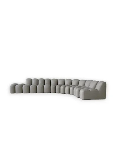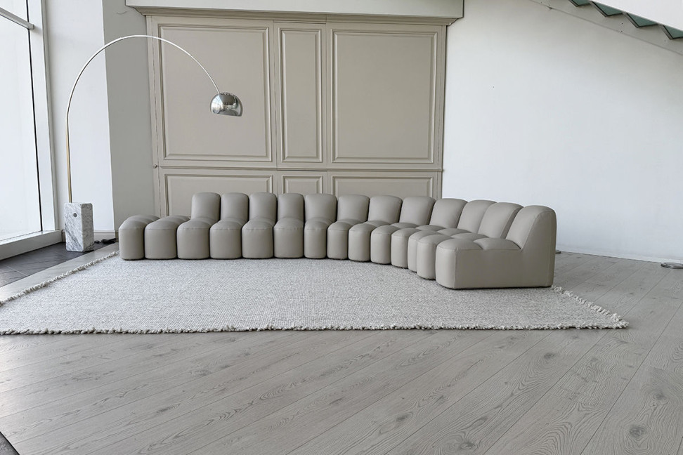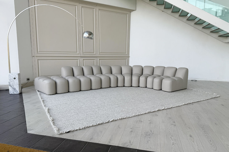 The Array Sofa on expo offer in our showroom has a gray leather upholstery. Its curved shape is composed of small manageable modules with or without a backrest. This L-shaped composition makes it a distinctive and impactful sofa that is as well suited to public spaces, such as hotel lobbies or offices, as it is to modern homes.