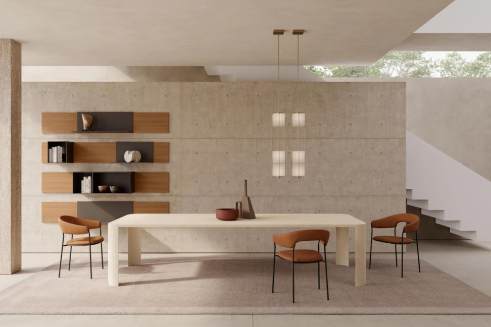 The Bonnet Dining Table can be customized by choosing from different sizes, tabletop shapes, and material finishes. The monomaterial variants and the special Coccioperla surface allow for a table with a contemporary, bright, and uniform look.