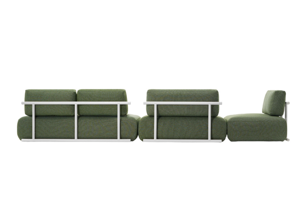 The peculiarity of the outdoor version of the Cosy sofa is found in the painted stainless steel structures positioned on the back of the backrest. These structures perform a dual function: on the one hand, they provide structural support, ensuring the solidity and stability of the sofa; on the other hand, they add a decorative touch, enriching the overall aesthetics of the product.
