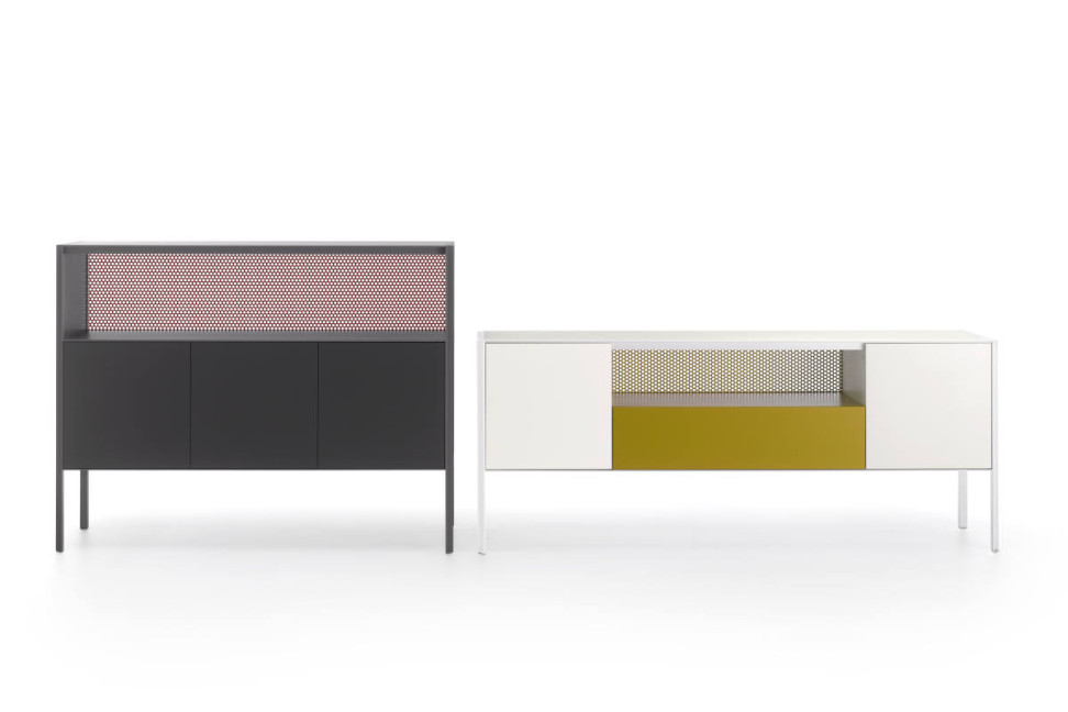 The hallmark of these storage units is the possibility to play with the materials, creating lively and elegant contrasts, as the combination of the matt lacquered metal frame and the backrest in perforated sheet. MDF Italia realizes the Heron storage unit with the side panels or in glass or panel in the same lacquered finish as the structure.