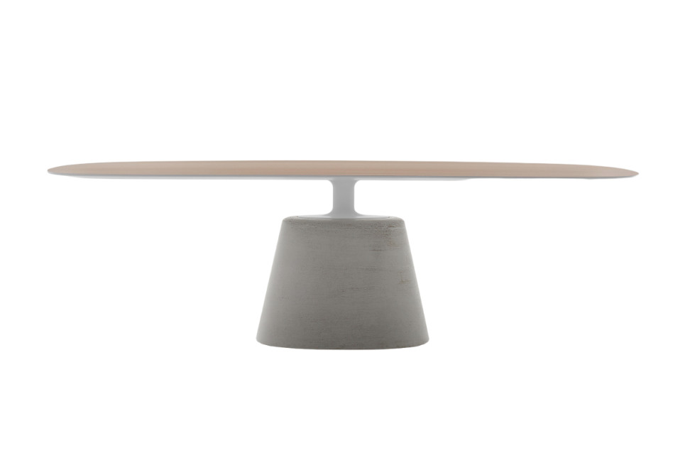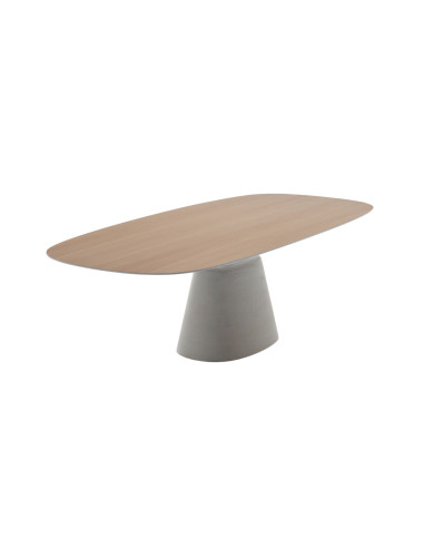 The Rock Table Maxi, designed by Jean Marie Massaud, presents itself as a modern and accattic choice for both indoor and outdoor furniture. Thanks to its distinctive and versatile design, it fits perfectly in different settings, offering a touch of originality and style. Its unusual shape, a rectangle with rounded corners, encourages interaction and dialogue between people sitting around it. With a design that combines radicality and sensuality, softness and boldness, this table is perfectly suited to various settings, including modern home environments, lounges, offices, reception rooms or meeting rooms, adding a unique and bold touch. The table base is made of lightened concrete, which ensures stability and solidity. For the indoor version, the table top is made of bleached oak wood, stained brown or canaletto walnut, giving it an elegant and refined look. The choice of material for the wooden top adds warmth and character to the table, creating an interesting contrast with the concrete base.
