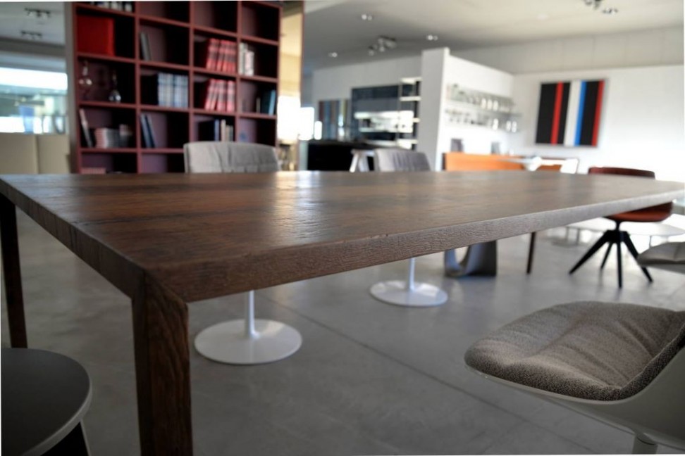 The Tense Material table, on offer in our showroom, stands out for its large size, but it does not visually weigh the product, and therefore the ability to accommodate numerous diners.