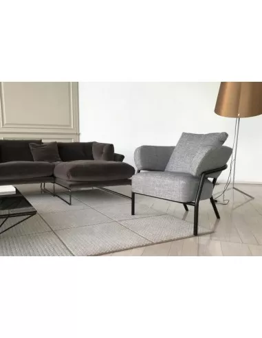 The Nanì small armchair, in expo offer in our showroom, is characterized by a sober design with soft and enveloping shapes that make it perfect to create a warm atmosphere in modern domestic spaces. The gray and white fabric upholstery is combined with a very elegant matt black painted metal structure that lightens the overall volume. A soft back cushion covered in the same fabric contributes in making the seat even more comfortable.