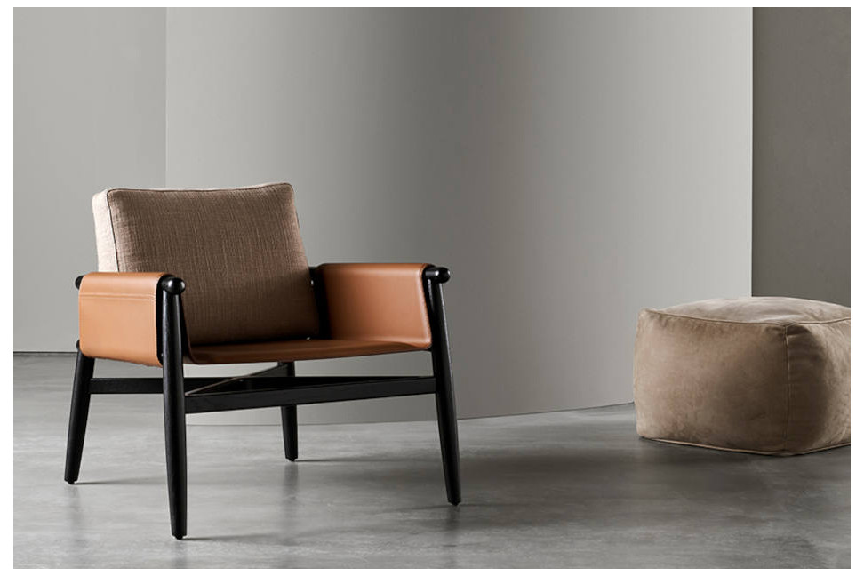 The Teresa armchair, presented by Meridiani at the suggestion of Andrea Parisio, features a visually textured solid wood frame and comes with seat and backrest options in two versions: the "soft" version, plush and welcoming, with fabric or leather upholstery, or the "leather" version, with a leather shell that defines the seat, backrest, and armrests. The Teresa armchair is also available with an accessory pocket for storing items, to be placed on the armrests.