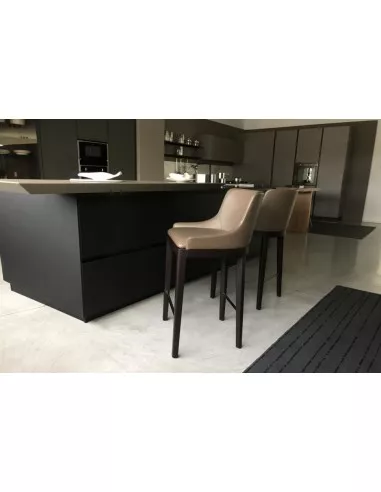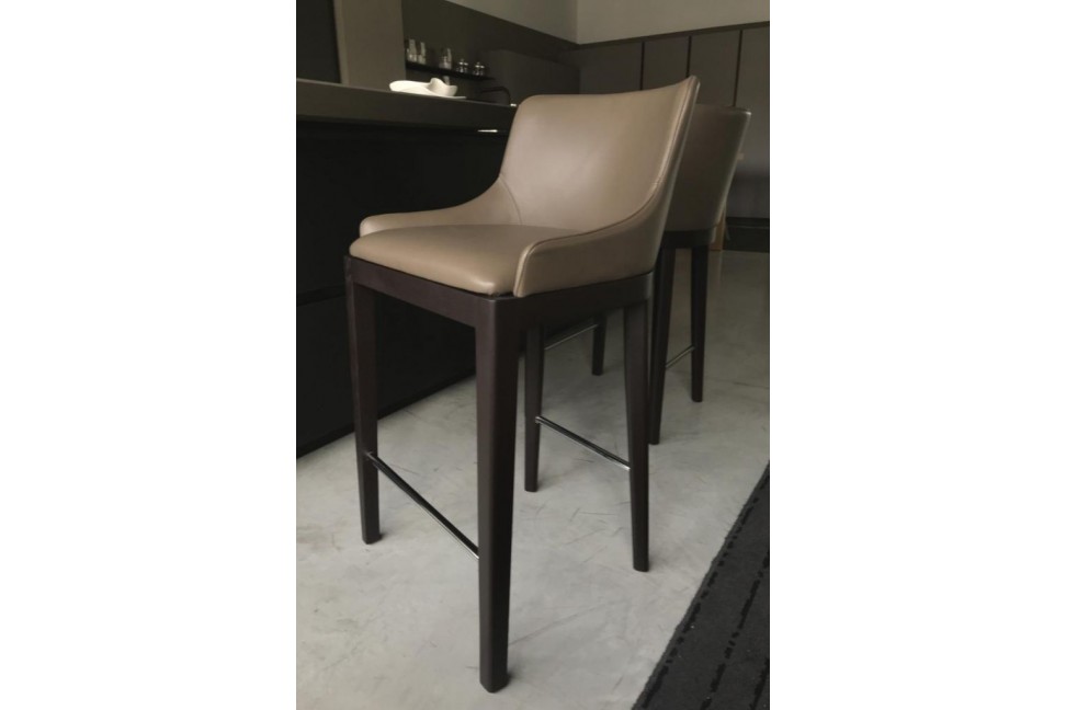 The Liberty stool, in expo offer in our showroom, is characterized by an elegant taupe leather upholstery highlighted by the dark brown stained ash base, whose combination creates a striking colour contrast.