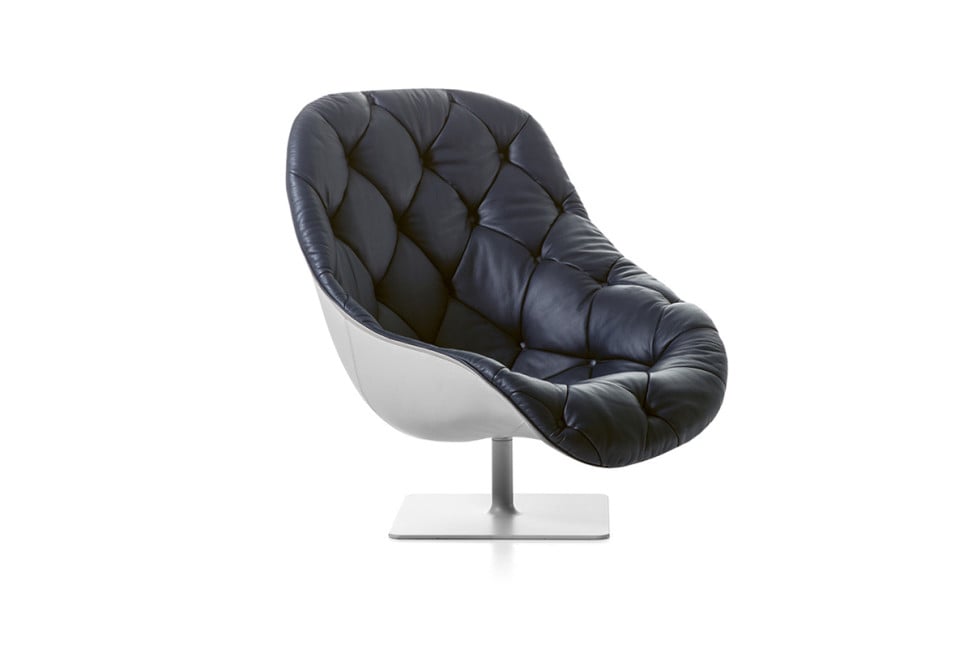 The Bohemian armchair by Moroso is characterized by a frame in resin, upholstered with flame-retardant injected foam, and a base in varnished steel, also available revolving, with glides in rubber. All the cushions are realized in goose down, covered with removable fabric or leather.
