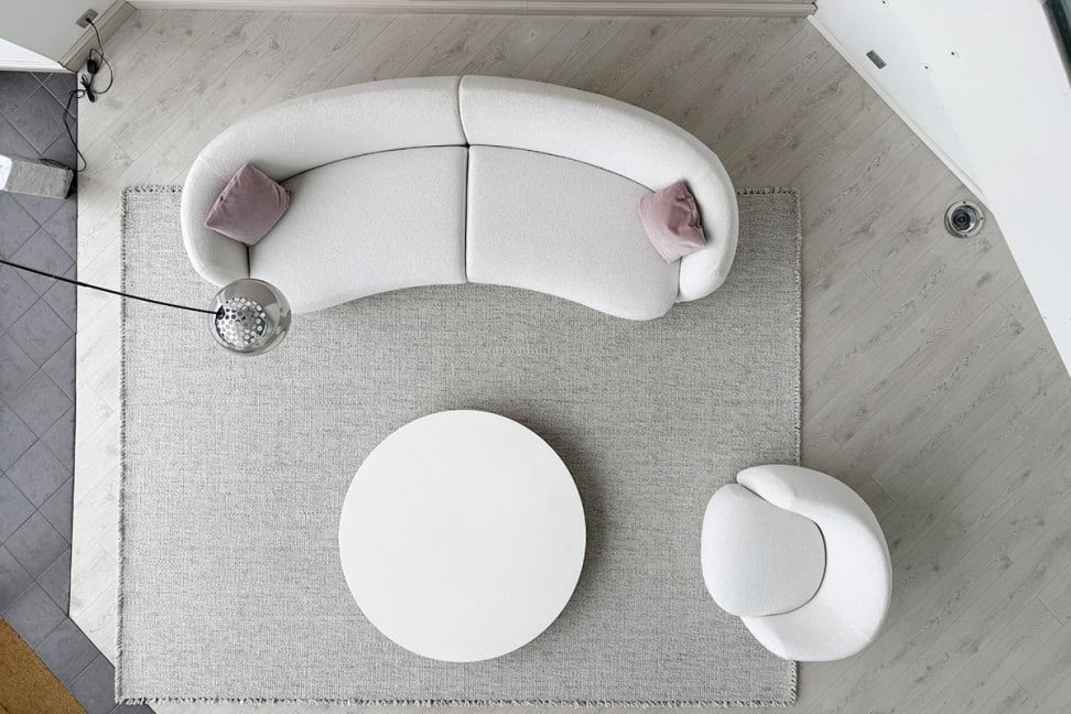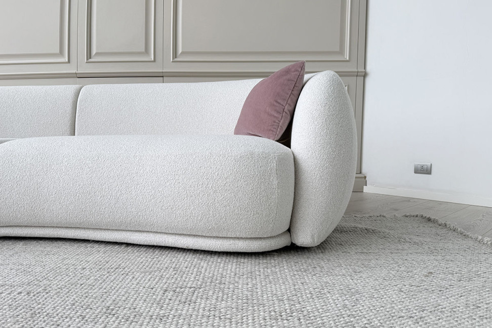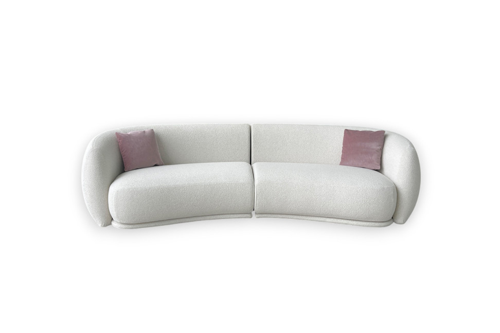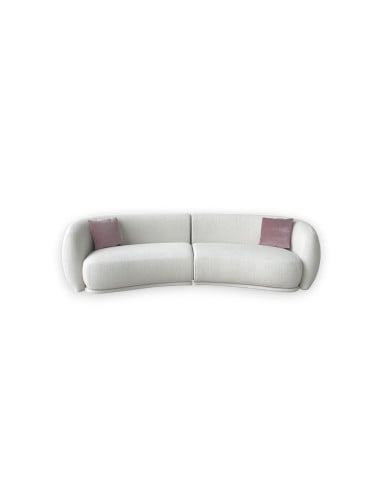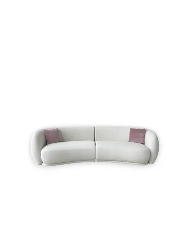 The Pacific Sofa on expo offer in our showroom is covered with soft white fabric. The legs are black polypropylene, and it includes two decorative cushions filled with goose feathers in a soft antique pink color.