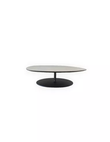 This coffee table is characterized by a formal simplicity that makes it modern and extremely versatile, therefore able to furnish areas with both formal and informal style. The thin ovoid-shaped top almost seems to slip on the steel base, giving the sensation that it is suspended in mid-air.