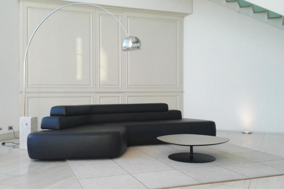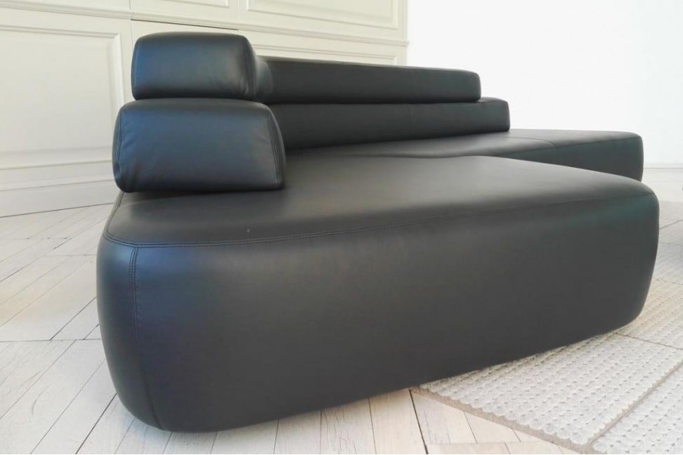 The Rift sofa, on expo offer in our showroom, is an original piece of furniture with an undeniable visual impact, characterized by a peculiar L shape that makes it the undisputed protagonist of the environment in which it is placed. The black leather upholstery emphasizes and outlines its shape.