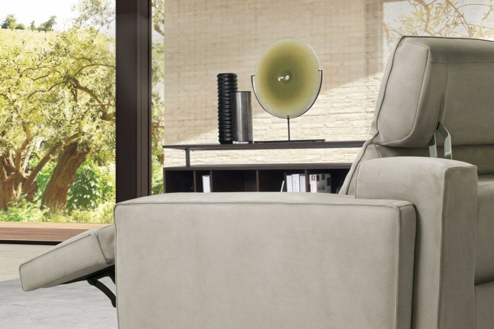 Available in various sizes, Iago stands out for the particular plucked seams that go along the covering, in fabric or leather, and embellish its look. Furthermore, it is possible to recline the headrest and the footrest through internal mechanisms, maximizing the feeling of comfort.