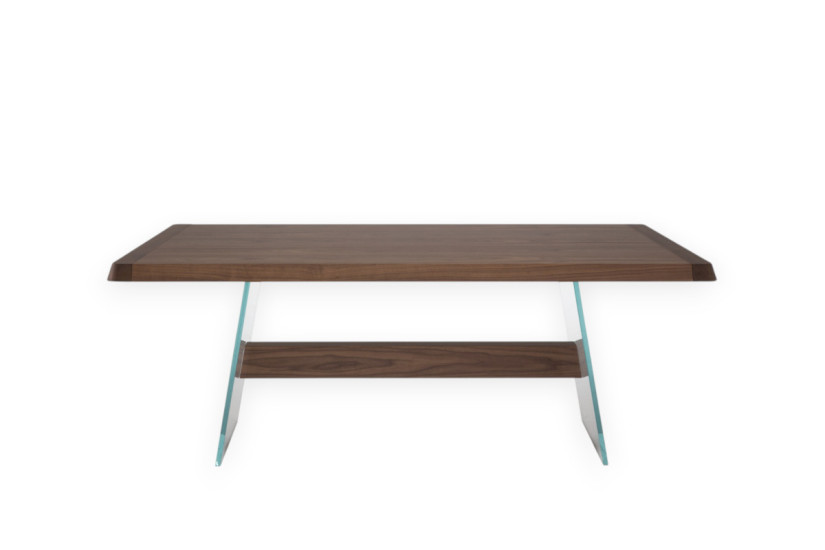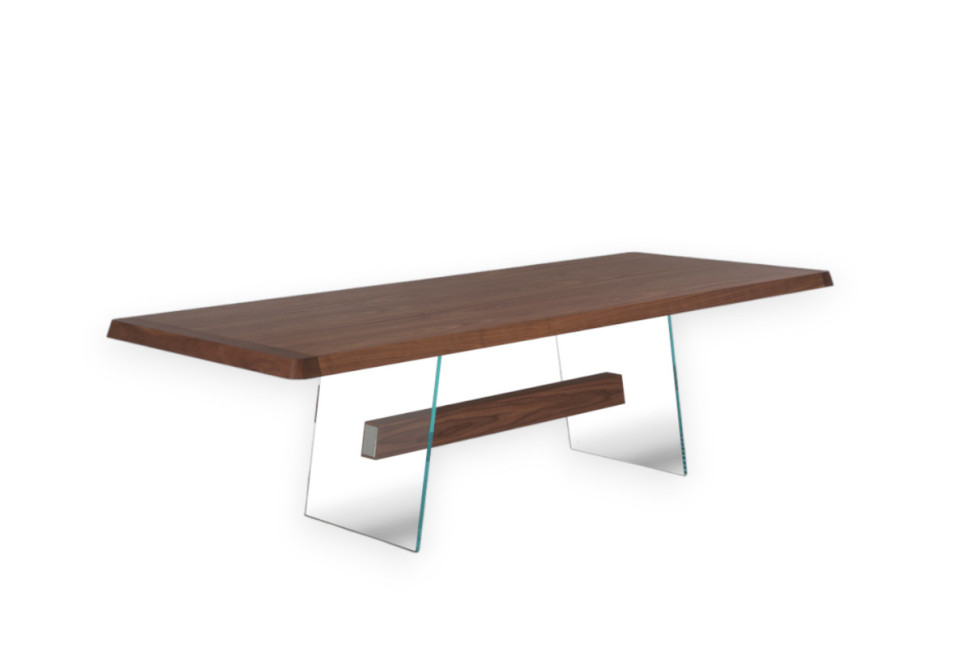 Mauro Lipparini has collaborated with Natuzzi Italia to present the Phantom Table, a modern dining table with a striking visual impact that combines the solidity of wood with the lightness of glass. The result is a designer dining table that appears to float, thanks to its slanted glass legs. A wooden insert connecting the legs and the solid top defines the piece, creating a dining table suitable for numerous contexts, both private and business.