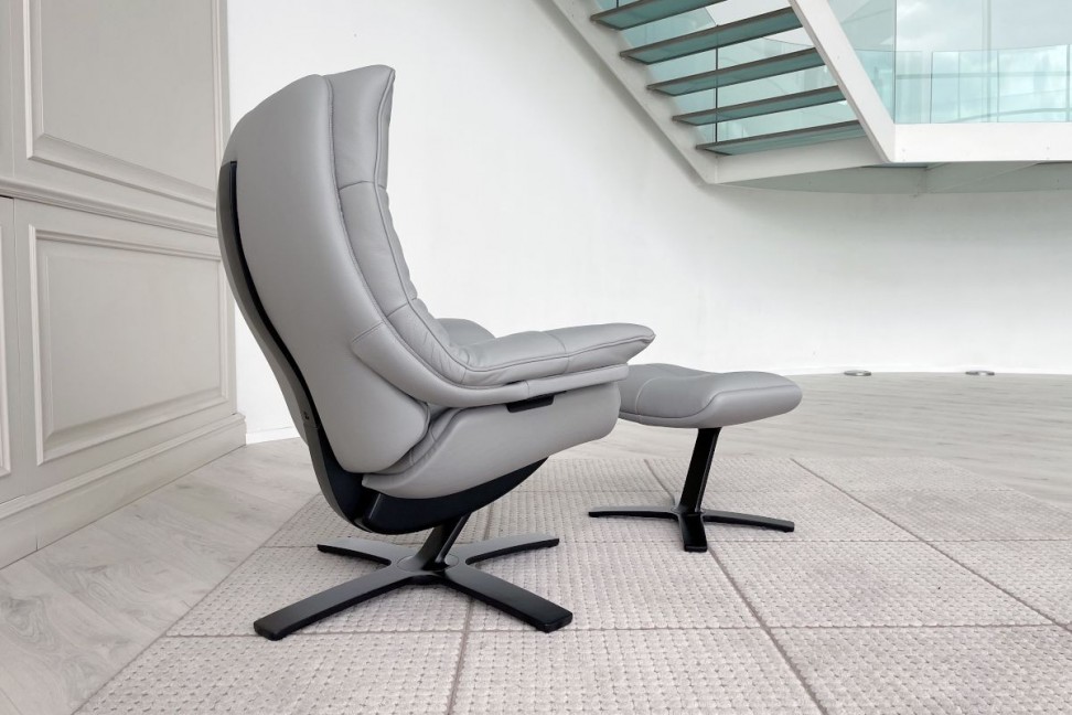 The Re-vive Quilted King armchair on Expo Offer in our showroom is accompanied by a comfortable footrest; both are characterized by a black finish base and structure; the upholstery is in ice gray leather.
