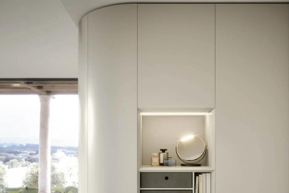 The Alfa curved hinged door wardrobe by Novamobili is a unique and versatile solution for those seeking original and refined design.
