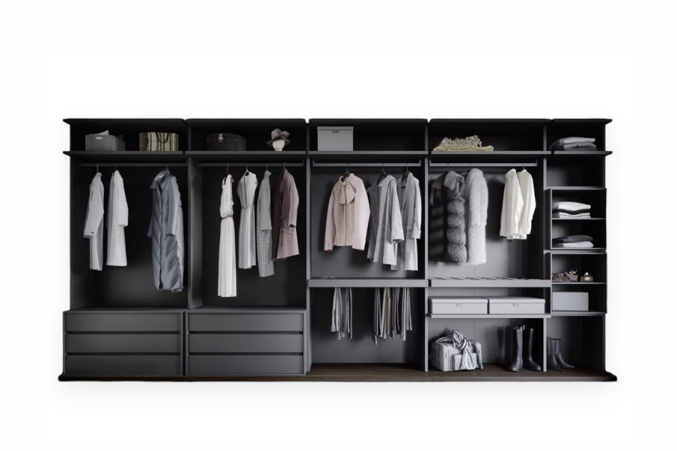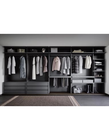 Technical Features: The Ben closet offers a wide range of finishes to choose from, such as Ardesia, Oxford, and Tweed for the interiors, eco-wood, all types of matte, oxidized, and super matte lacquers for the structure and doors. The Ben closet stands out for its side panels, which elegantly define the space, creating a clean and well-organized environment.